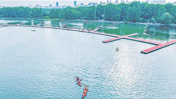 The Tingtao Swimming Pool opened to the public on a trial basis at the East Lake scenic area in Wuhan, capital city of Hubei Province, on July 16, 2023. Built in the 1970s, the swimming pool has taken on an entirely new look through renovation and upgrading. It features supporting facilities such as changing rooms and shower rooms, and water entertainment activities including kayaking, paddling and rowing dragon boats. (Photo: Chutian Metropolis Daily)