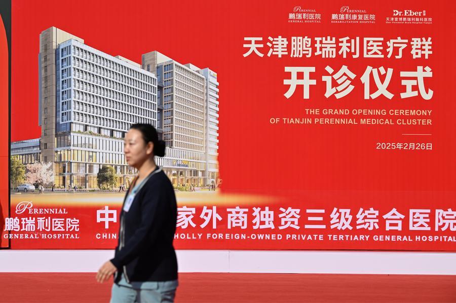 A medical worker walks by a billboard for the opening ceremony at the Perennial General Hospital Tianjin, China's first wholly foreign-owned, tertiary general hospital, in north China's Tianjin Municipality, Feb. 26, 2025. (Xinhua/Li Ran)