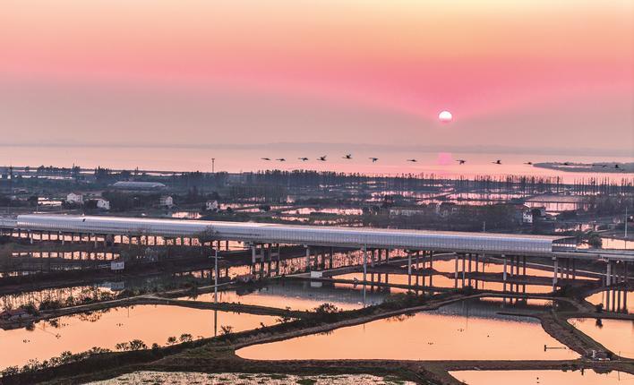 View of migratory birds flying over Shuangliu Yangtze River Bridge