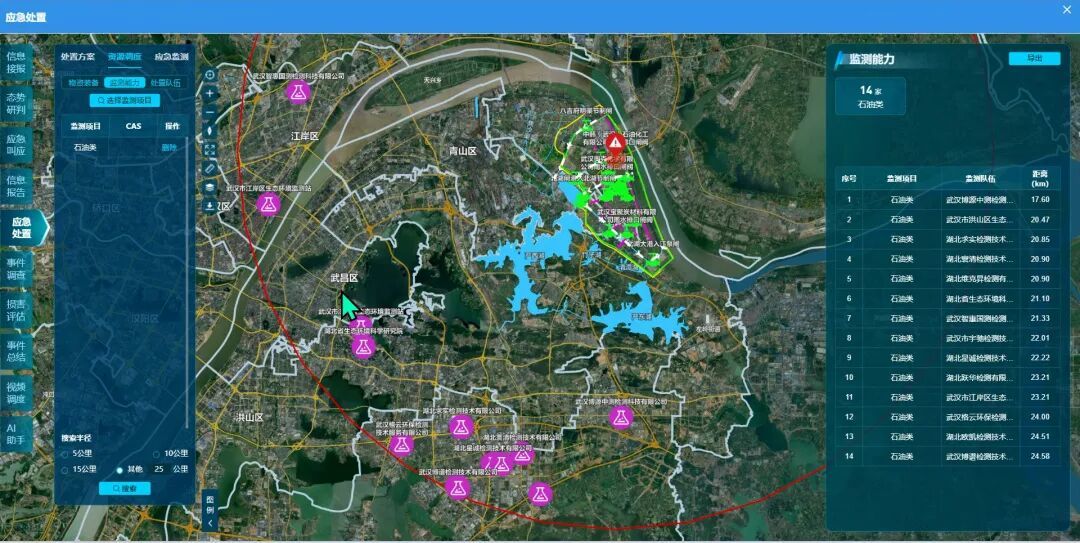 演练选取两起事件叠加的复杂情景,以武汉进入雨季,连日阴雨叠加暴雨红色预警的气象条件开展,两起事件链式反应对园区突发水污染事件环境应急三级防控体系构成了严峻挑战。在甲苯泄漏事件先期处置中,青山区人民政府第一时间启动区级应急响应,成立区级指挥部,组织对泄漏罐体进行封堵、泡沫覆盖、喷淋降温、倒罐等作业,利用北湖闸港作为临时应急空间,采用吸附隔油、芬顿氧化等工艺对事故废水进行处置。在接到石化企业火灾事故报告后,武汉市迅速提级启动三级应急响应,依托“一园一策一图”运转方案,关闭化工大道雨水闸、北湖小港节制闸,有效控制事故废水扩散。整个处置过程中,充分运用武汉市环境智慧监管平台,实现态势研判、物资调配、监测能力检索、应急处置方案生成等功能的智能化。通过平台AI生成的应急处置方案,快速锁定周边应急物资、监测能力和救援力量,大幅提升了应急响应效率。同时,利用便携式光离子化检测器、环境走航监测无人车、“城市智眼”低空遥感监测系统等高精尖设备,实现污染带实时跟踪识别和无死角监测,展现了科技在环境应急管理中的重要作用,为突发环境事件应急处置提供了新的思路和方法。
