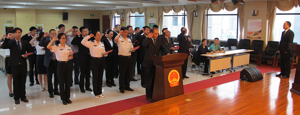 宣誓仪式上,全体人员面向国旗、国徽,领誓人左手抚按《中华人民共和国宪法》,全体宣誓人举起右拳庄严宣誓:“我宣誓:忠于中华人民共和国宪法,维护宪法权威,履行法定职责,忠于祖国、忠于人民,恪尽职守、廉洁奉公,接受人民监督,为建设富强、民主、文明、和谐的社会主义国家努力奋斗!”