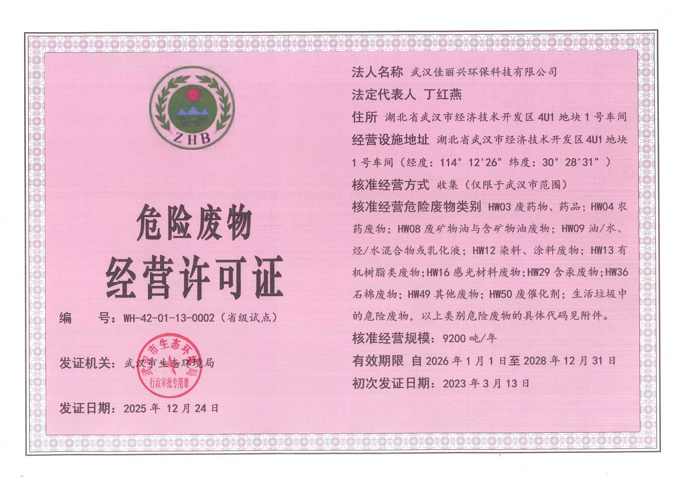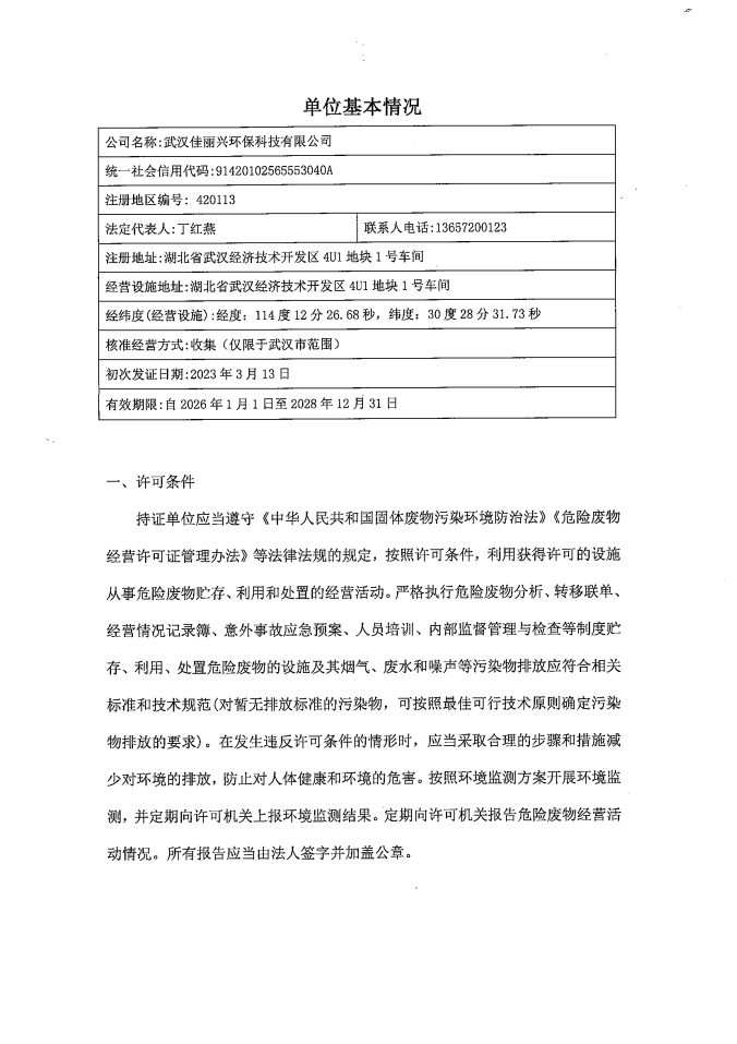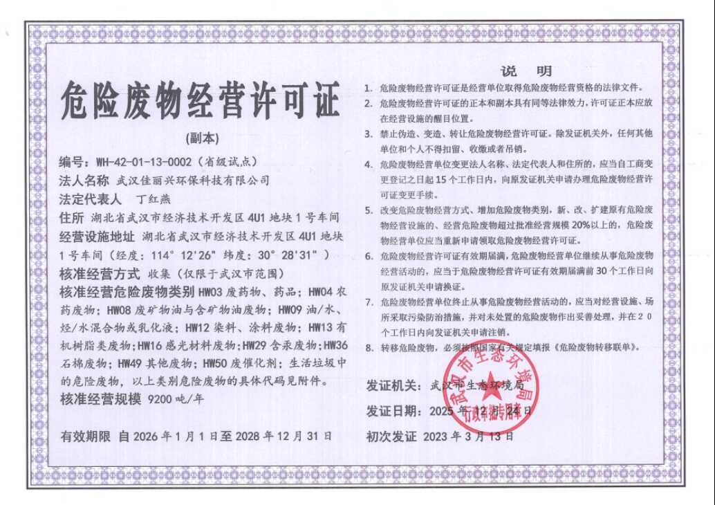 你司《关于危险废物收集试点经营许可证到期换证的申请》收悉。经研究,你司小微企业危险废物收集试点项目环境保护竣工验收合格,按要求提交自评估报告,完成专家评审会反馈问题整改并通过专家组复核,符合危险废物经营许可证续证的条件。我局向你司续发《危险废物经营许可证》,证书编号为WH-42-01-13-0002(省级试点),有效期为2026年1月1日至2028年12月31日。