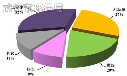通过各监测点一年以上的数据分析,分别得出武汉市PM2.5综合源解析结果:工业生产排放32%、机动车排放27%、燃煤源20%、扬尘源9%、其它来源(生物质燃烧、生活源、农业源等)12%,如图9所示。