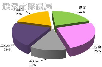 武汉市PM10综合源解析结果:扬尘源25%、燃煤源22%、工业生产排放21%、机动车排放19%、其它来源(生物质燃烧、餐饮、农业生产等)13%,如图10所示。