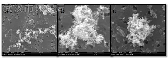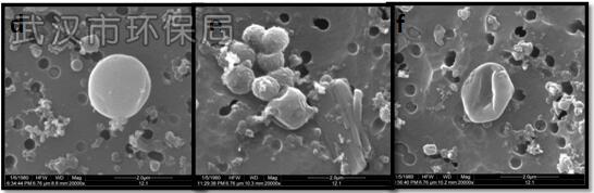 高分辨率SEM图像可以清晰地显示亚微米级的颗粒尺寸和微观形貌,根据扫描电镜的单个颗粒物的形貌特征,可判断出武汉市可吸入颗粒主要包括烟尘集合体、飞灰、矿物颗粒及一些不能判断类型的细颗粒物。
