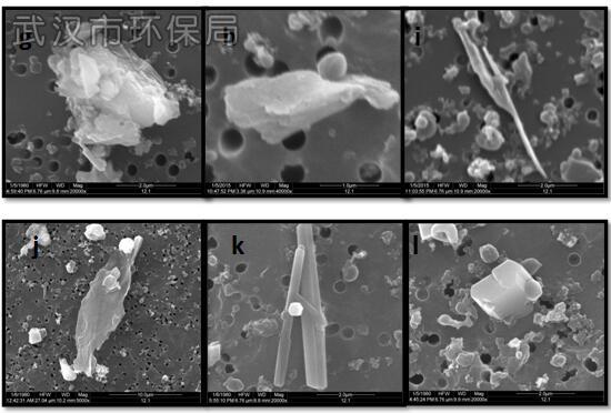 大气中矿物颗粒主要有两种来源:扬尘和二次大气化学反应产物。扬尘包括建筑扬尘、风起扬尘、道路扬尘和工业扬尘等,他们一般具有不规则的形状特征;规则的矿物颗粒一般认为是二次大气化学反应生成的(图13)。矿物颗粒是武汉市PM10和PM2.5中主要的组成之一,大部分矿物颗粒为不规则颗粒,其形貌特征可细分为片状、块状和针状等。