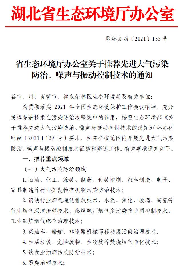 省生态环境厅办公室关于推荐先进大气污染防治、噪声与振动控制技术的通知(鄂环办函[2021] 133号)