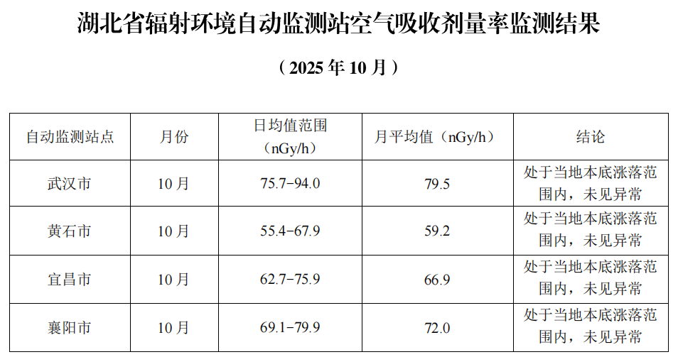 湖北省辐射环境自动监测站空气吸收剂量率监测结果(2025年10月)