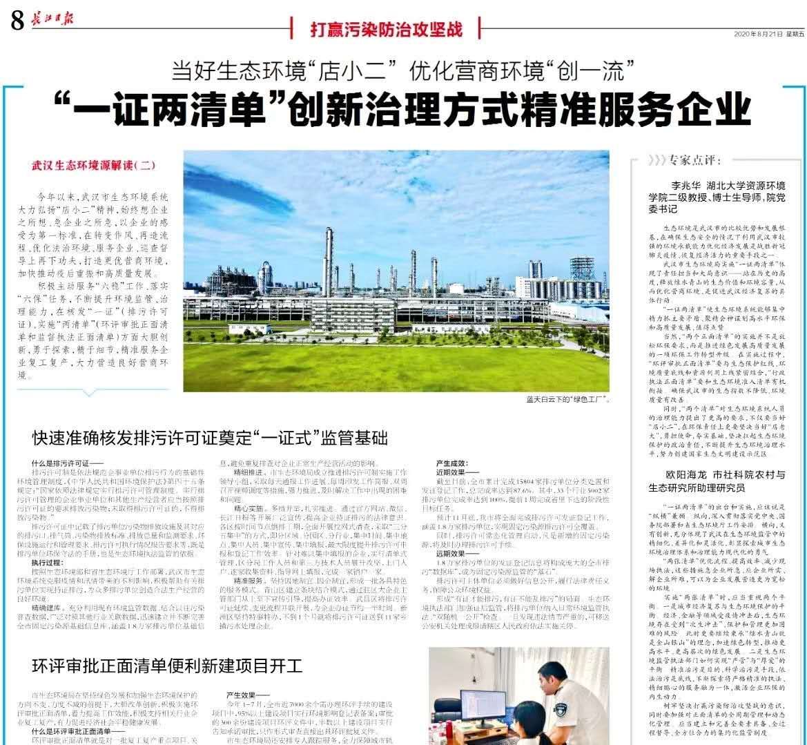 近期,市区通过各类媒体,加大了排污许可宣传力度,认真做好制度政策解读,有序引导社会公众更好地参与监督企事业单位排污行为,形成政府综合监管、企业依证守法、社会共同监督的良好氛围。2020年8月18日下午16时,武汉市人民政府新闻办公室召开“当好生态环境‘店小二’ 优化营商环境‘创一流’”新闻发布会暨答记者问,宣传了排污许可工作。8月19日,《武汉生态环境访谈录》(第2期)在武汉广播电视台《长江视点》播放了一期15分钟新闻访谈节目,对排污许可等工作进行了深入解读。8月21日,长江日报在第8版“打赢污染防治攻坚战”刊登了“快速准确核发排污许可证奠定‘一证式’监管基础”。现将相关内容节选发给大家。