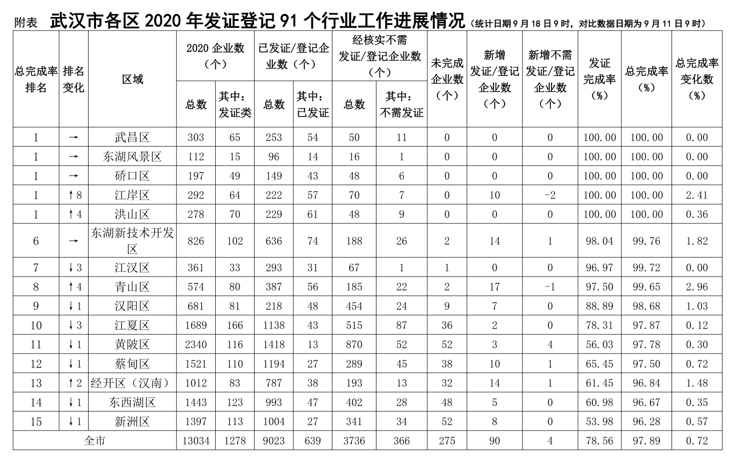 根据平台数据统计,截至 2020 年 9 月 18 日上午 9 时,各区2020 年 91 个行业的发证完成率为 78.64%,总完成率为 97.9%。武昌区、东湖风景区、硚口区、江岸区、洪山区总完成率均达到100%,并列全市第一。东湖新技术开发区、江汉区、青山区总完成率分别为 99.76%、99.72%、99.65%,工作进度位于全市前列,分别还剩 2 家、1 家、2 家发证企业未完成,有望在近期提前完成全年的目标任务。武汉经济技术开发区(汉南区)、东西湖区、新洲区总完成率分别为 96.84%、96.67%、96.28%,排名为全市后 3 位,还需进一步加大力度。东湖新技术开发区、青山区发证完成率分别为 98.04%、97.5%,工作进度位于全市前列;东西湖区、黄陂区、新洲区发证完成率分别为 60.98%、56.03%、53.98%,发证完成率排名为全市后 3 位。