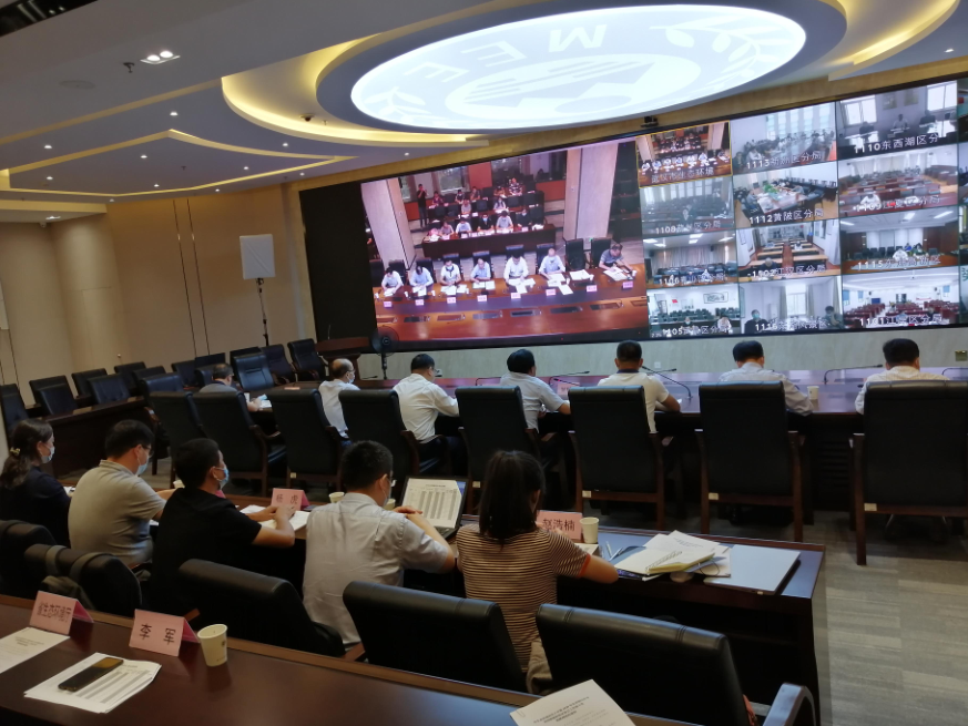 2020 年 9 月 18 日上午,市生态环境局阎忠宁局长主持召开全市排污许可清理整顿和发证登记工作第 9 次视频调度,生态环境部环境工程评估中心邹世英副主任、生态环境部环境影响评价与排放管理司杨龙处长及生态环境部第六包保组成员,省生态环境厅二级巡视员兰国桢及厅调研组其他成员在主会场参加了视频会议;各区分局局长、分管领导和排污许可管理人员在区分会场参加了视频会议。