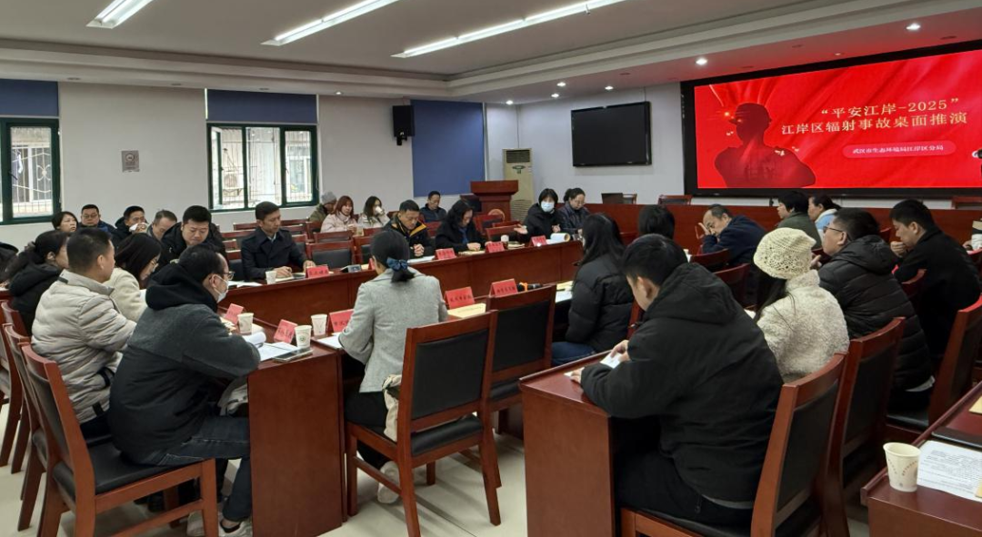为落实省市“干部素质提升年”工作要求,在工作实践中促进干部专业能力提升,检验江岸区辐射事故应急预案的有效性,进一步提高辐射事故应急处置和反应能力,全面提升辐射应急水平,近日,武汉市生态环境局江岸区分局联合武汉农业检测中心(武汉市农业环境监测站)组织开展2025年辐射事故应急演练桌面推演,江岸区卫健局等相关部门参加。