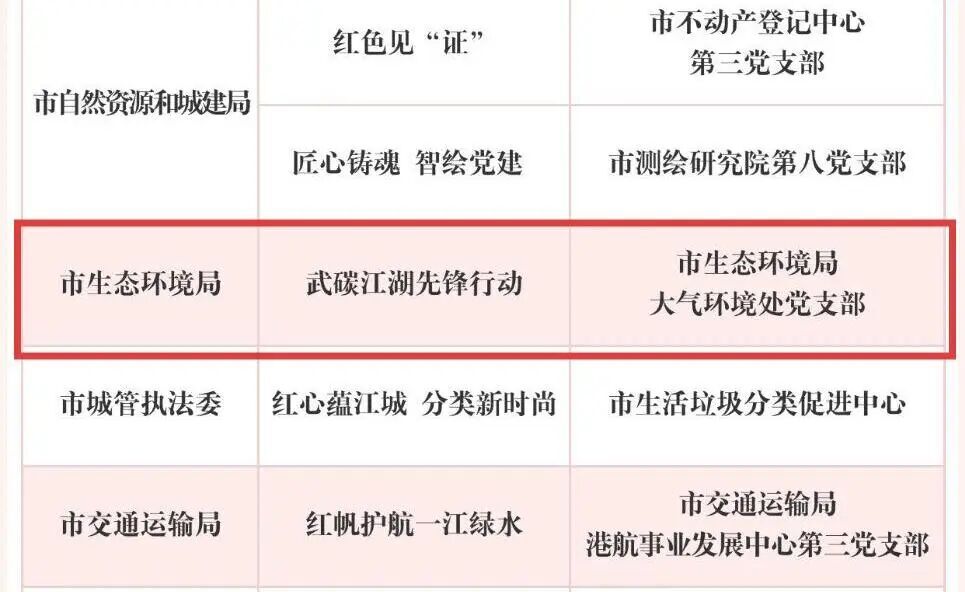 2025年12月29日,2025年市直单位基层党建品牌名单正式发布,武汉市生态环境局打造的基层党建品牌“武碳江湖先锋行动”入选。