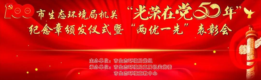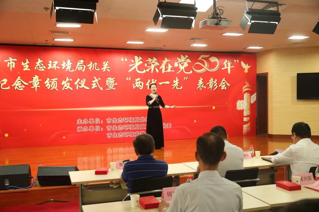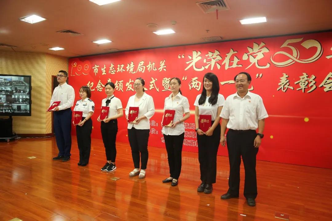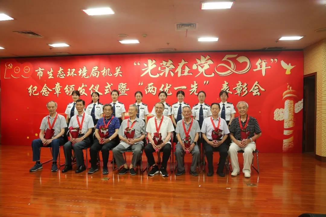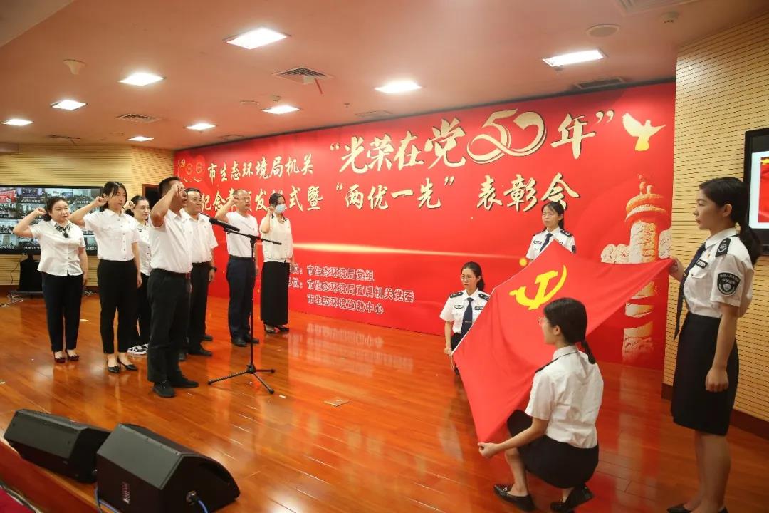 6月29日,在中国共产党百年华诞即将到来之际,武汉市生态环境局举行“光荣在党50年”纪念章颁发仪式暨“两优一先”表彰会议,为党龄满50年的党员颁发“光荣在党50年”纪念章,表彰局机关优秀共产党员、优秀党务工作者和先进基层党组织,庆祝即将到来的伟大的中国共产党的百岁生日。
