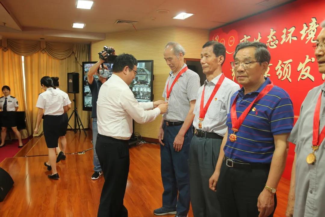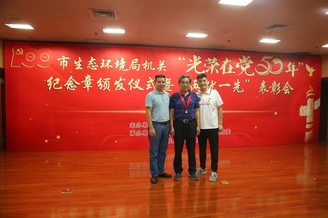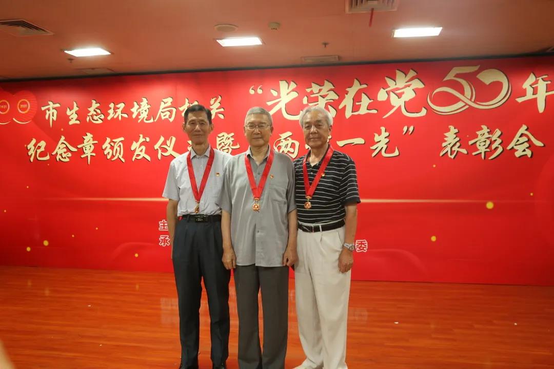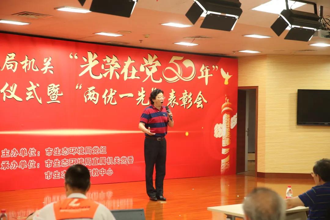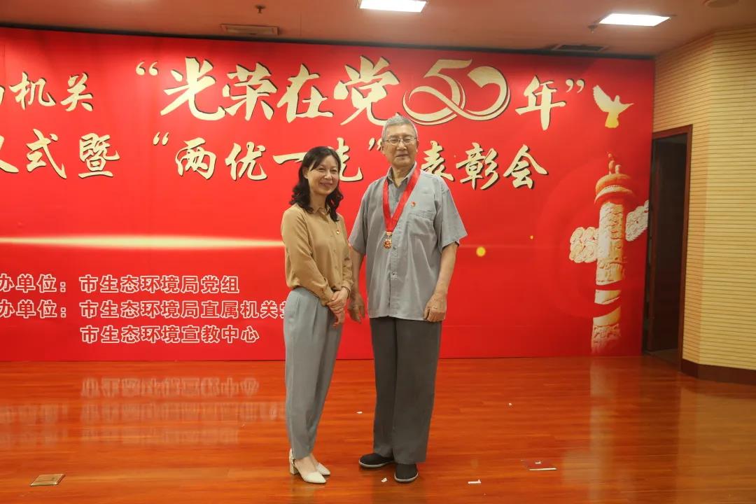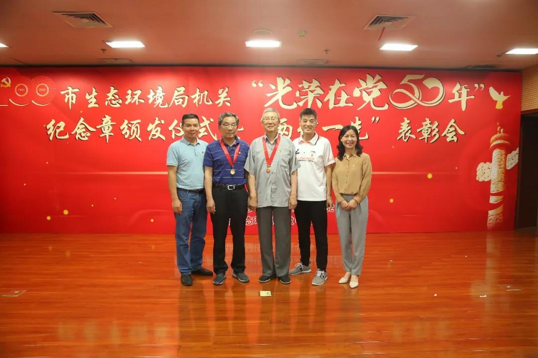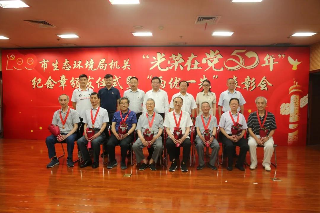 局机关“光荣在党50年”纪念章获得者代表才大永同志、张培增同志、王家源同志、吴兴国同志、何昇明同志、刘远光同志、唐绍华同志、廖长明同志接受这份光荣而崇高的敬意。市生态环境局党组书记、局长阎忠宁为他们颁发“光荣在党50年”纪念章。