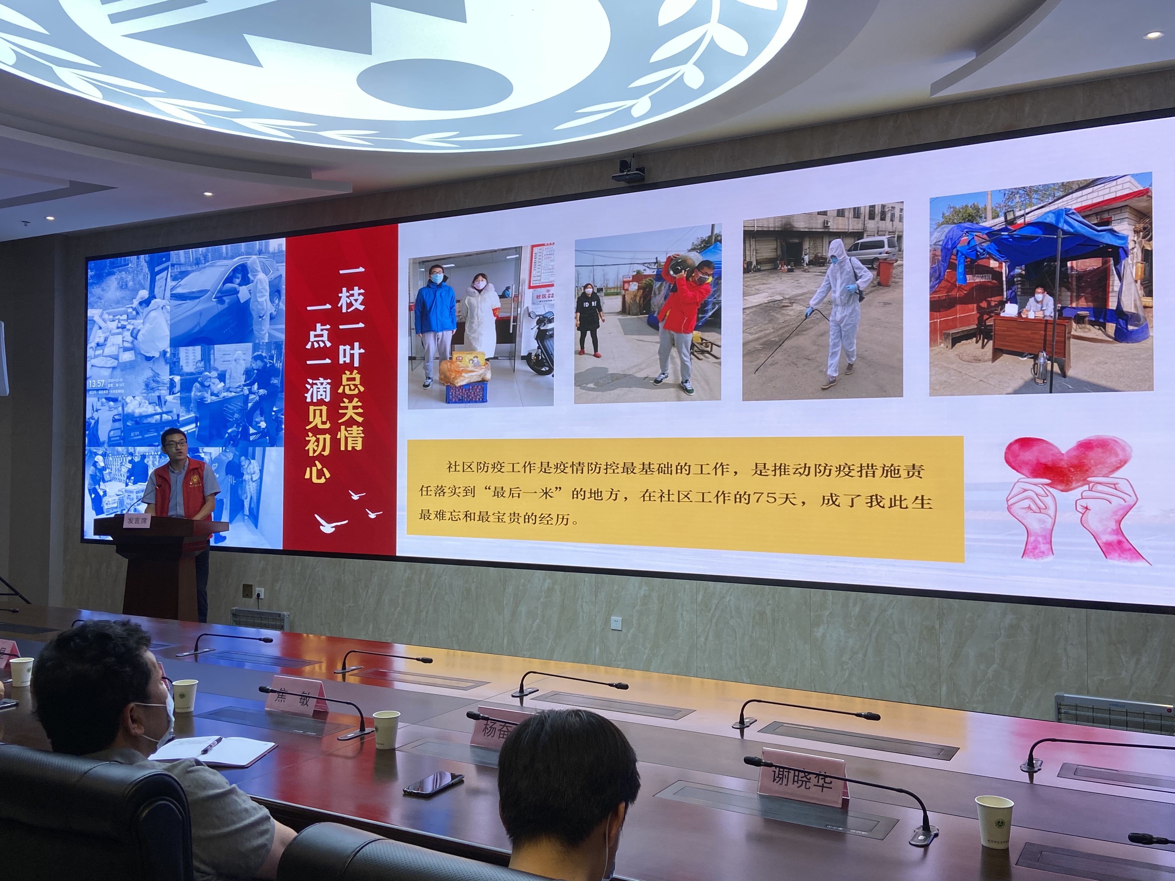 先进典型讲党课。以“冲锋在前,以身作则,只因我是共产党员”为题,下沉社区驻守服务党员先锋队先进典型代表金宪琦为大家讲授了一堂感人至深的微党课。他从国家到个人、历史到现在,细数了共产党员发挥先锋模范作用的感人故事,分享了疫情期间近三个月的下沉经历,他为孤寡老人筹集的两袋面粉,他在四张板凳上度过的无数个日夜,他那辆在社区门口孤零零的电动车,让在场的很多观众动容。