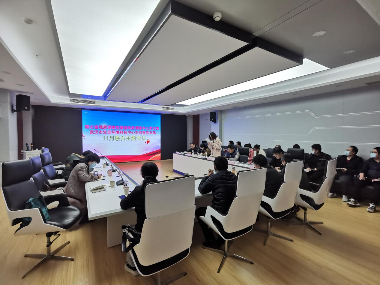 为深入学习贯彻党的十九届六中全会精神,加快推进生态环境合作交流,2021年11月30日下午,武汉市生态环境科技中心生态研究室党支部与湖北省地质调查院基础地质调查中心党支部在湖北省地质调查院大数据会议中心开展了11月份联合主题党日活动。武汉市生态环境科技中心党委书记李利桥及湖北省地质调查院党委书记戴光忠、党委副书记胡元平等二十余名党员参加了此次会议。