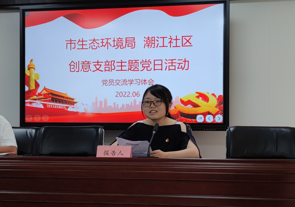 市生态环境局水生态环境处党支部李静雅、大气环境处党支部刘凡、土壤生态环境处党支部翟显之和潮江社区2名党员代表表结合6月主题党日学习内容,就《学习习近平总书记在中央政治局常委会会议研究疫情防控工作时的重要讲话精神心得体会》、《争做民族复兴的生力军》、《创意支部主题党日》等主题作出发言,交流学习体会。