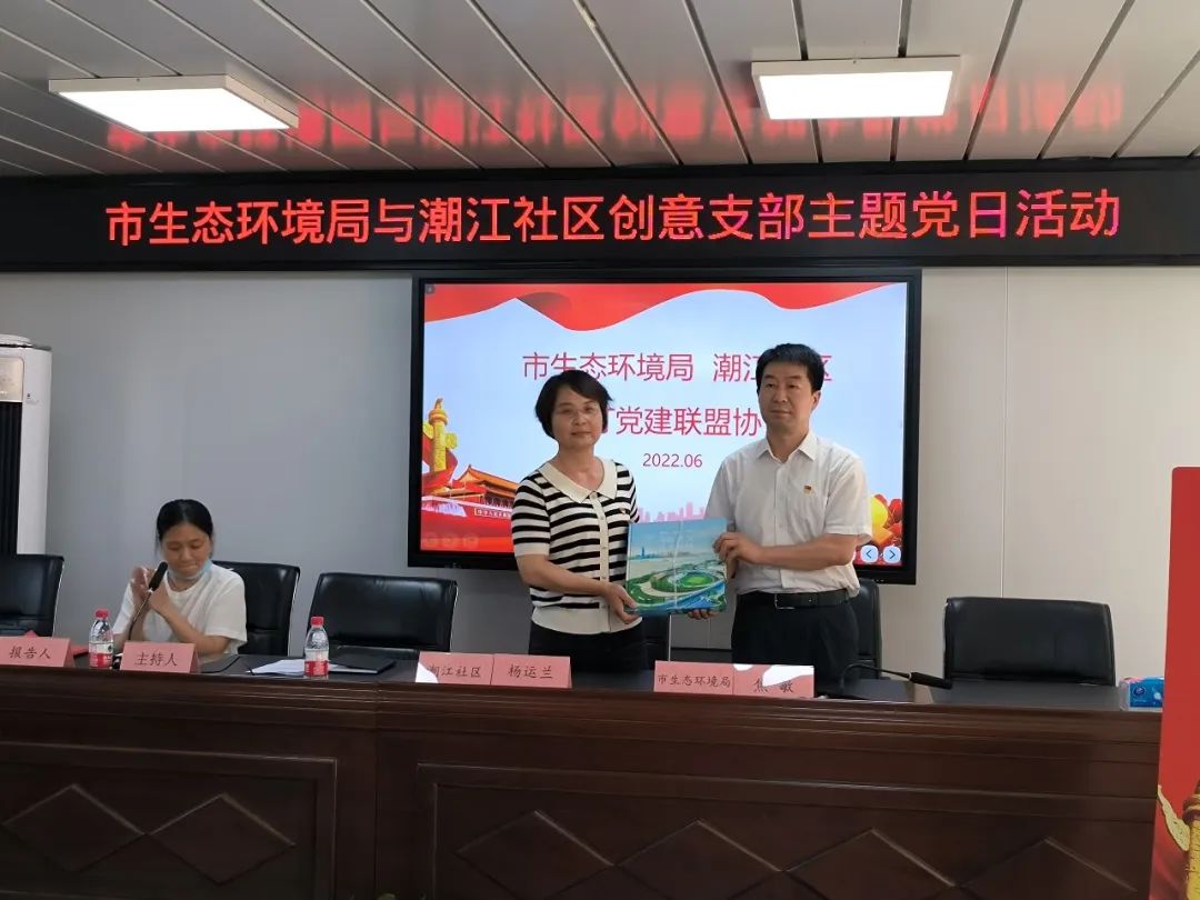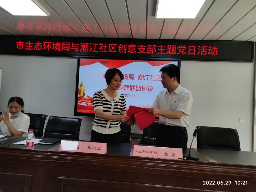市生态环境局直属机关党委专职副书记焦敏与潮江社区党总支书记杨运兰签订了《党建联盟协议书》,建立了“政治理论联学、阵地资源联享、主题活动联办、党员队伍联建、品牌形象联树”的党建联盟机制。