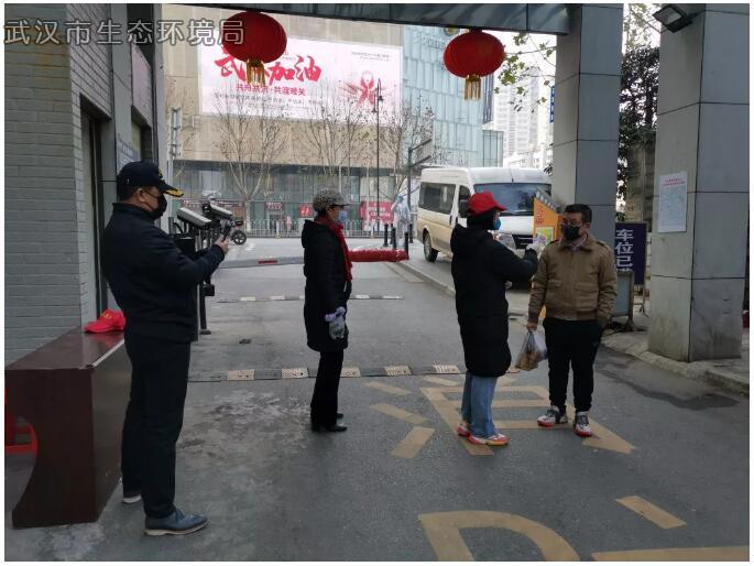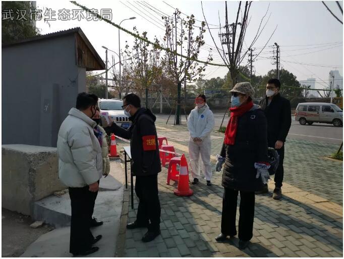 来到民意社区,我们生态环境局硚口区分局的同事和社区干部、公安派出所民警一起在社区入口设立卡点,开展疫情防控宣传、卡点值守和隔离观察人员帮扶等工作。民意社区距离这次疫情爆发源头----华南海鲜批发市场直线距离只有6公里,是高度危险区域,防控任务十分繁重。