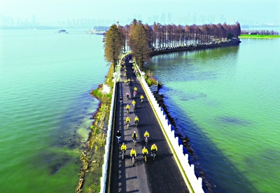在东湖绿道湖中段,尝鲜市民体验骑行 记者胡九思 航拍
