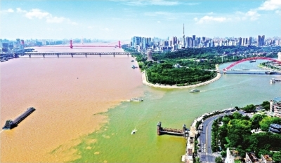 武汉南岸嘴位于长江和汉江交汇处,被誉为“长江文明之心”。汛期,长江含沙量较多,江水呈浊黄色,而汉江含沙量较少,江水显得碧波荡漾,两江在南岸嘴交汇后出现“泾渭分明”的景观。