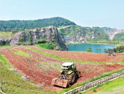 记者在现场看见,如今,一期主打的“矿花乐园”已经完工,原本满目疮痍、灰秃秃的山体已是草木葱绿,复垦的600多亩耕地、林地已见效益,裸露矿坑变身的翡翠湖已成为景区标志。如今,一期区域内正在种植新一批花种,开花后,园区内的色彩将更丰富。