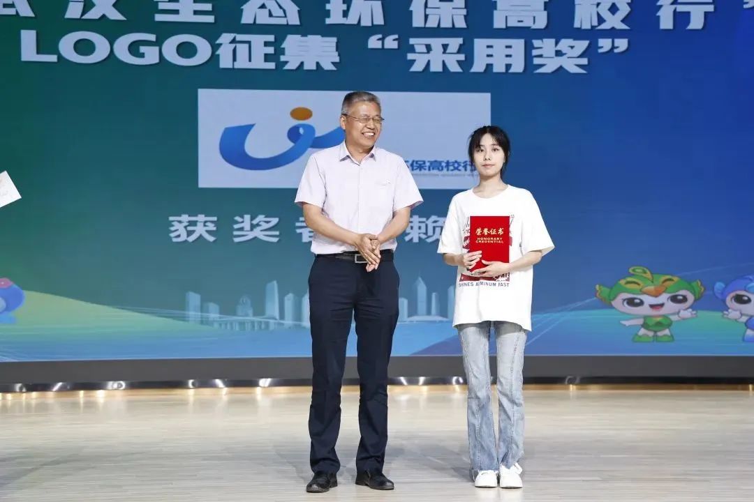 △武汉市生态环境局党组成员、副局长任宪友为“武汉生态环保高校行”LOGO设计“采用奖”获奖者赖欣颁发证书