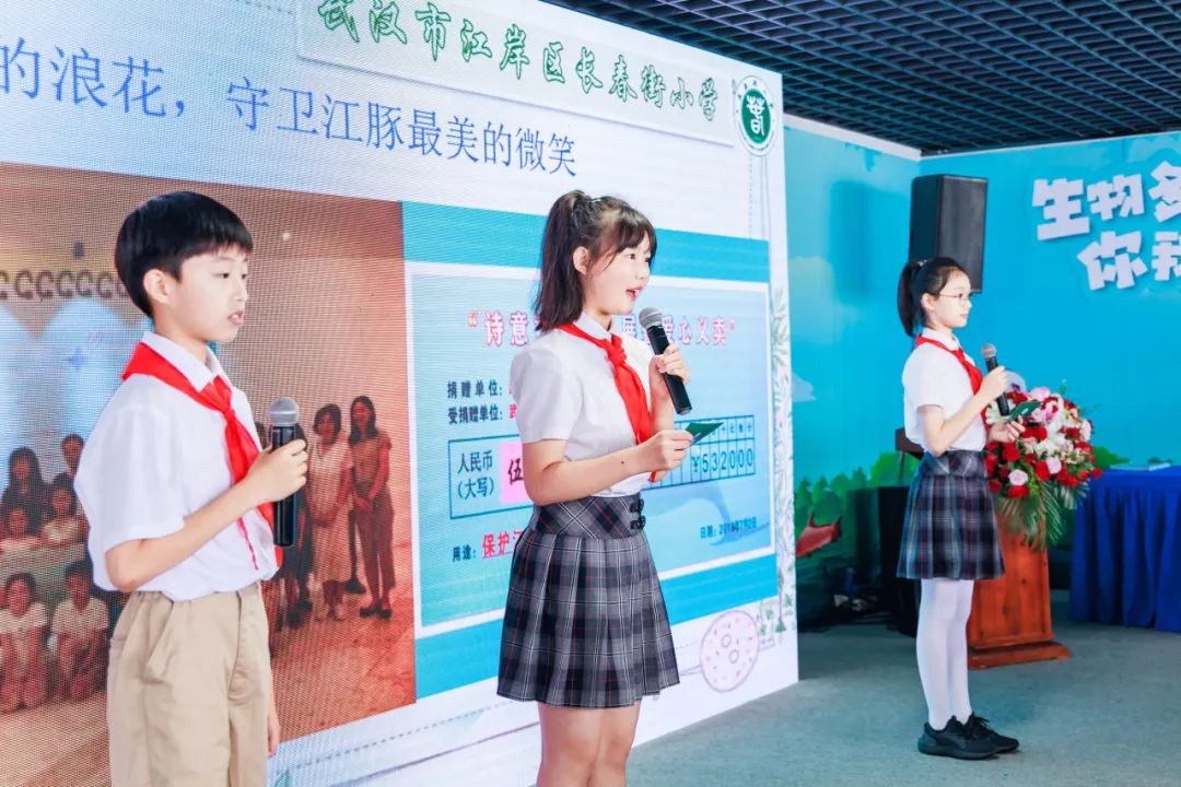 江岸区长春街小学的学生代表喻朱玲珑、何书涵、储煜哲与大家分享《守护的微笑:我与江豚的温情时刻》。
