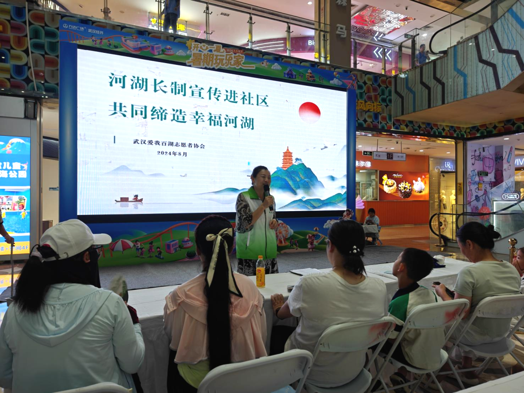 8月的武汉,炎炎夏日,酷暑难当。武汉经开万达里整整齐齐地坐着一群人,他们中有的是民间河湖长,有的是对爱湖护河感兴趣的社区居民。现场,全国最佳志愿服务组织武汉爱我百湖志愿者协会的工作人员正在介绍河湖长日常工作及暑期管控重点,宣讲结束后,大家一同前往附近的湖泊开展现场巡湖。