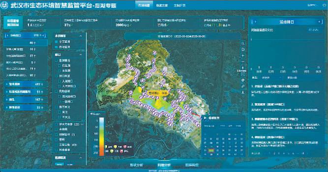 武汉市生态环境智慧监管平台创新运用“三维GIS+水质反演”技术,构建湖泊数字孪生体,实现健康状况“一屏统览”。