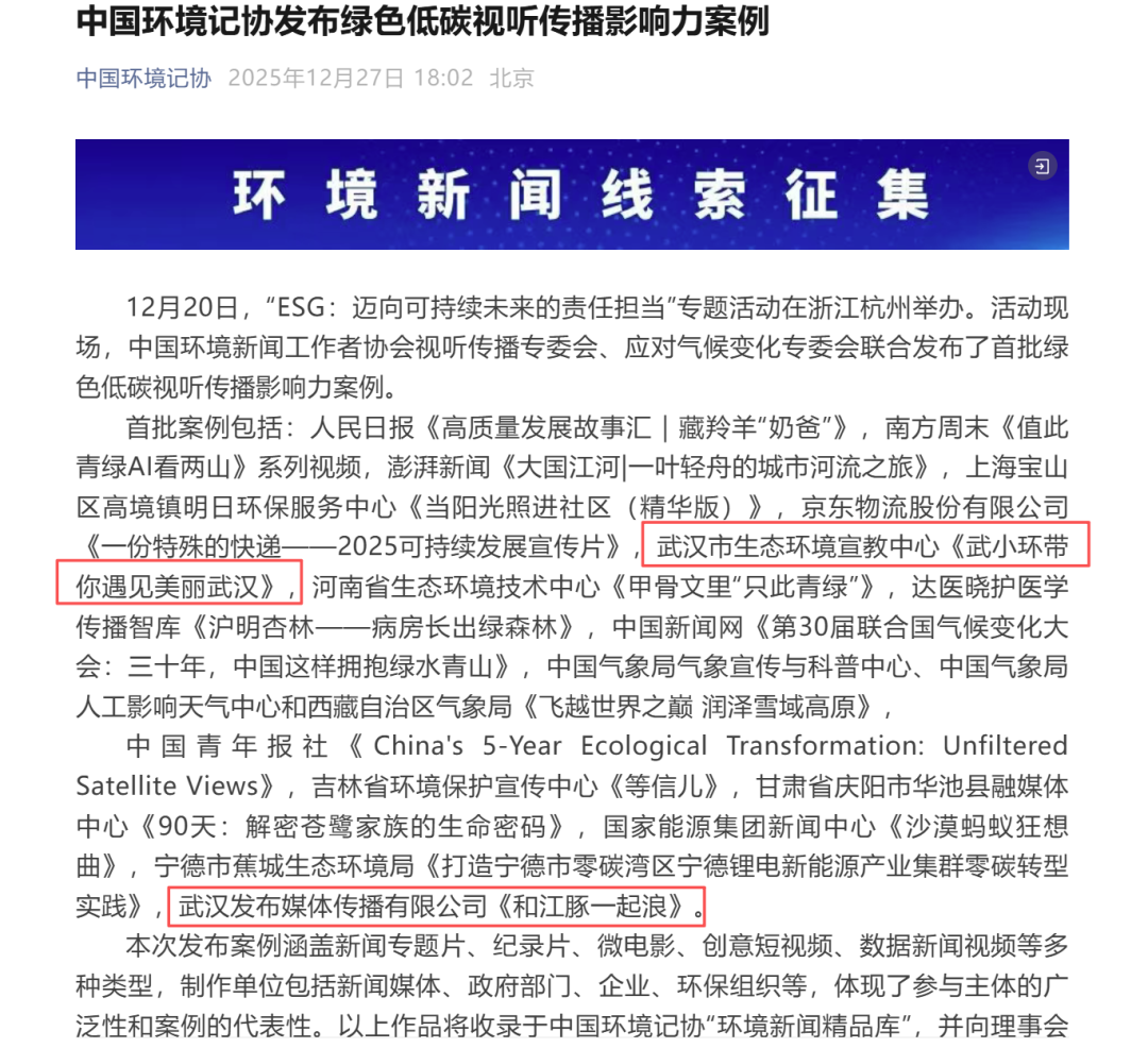 2025年全年,武汉立足传统媒体权威优势,建立起生态保护的话语体系,筑牢生态文明宣传主阵地,生态环境保护的经验成果持续获得国家级主流媒体聚焦关注:央视《焦点访谈》重磅报道武汉长江江豚试验性野化放归成效,《人民日报》推出专题版面解读武汉“城水共生”长江生态治理路径,新华网系统呈现武汉以“三美”建设提升生态承载力的实践,《中国日报》专题报道武汉降碳减污扩绿的绿色发展成效,央视新闻聚焦碳普惠、矿山修复、噪声地图试点、青山江滩“工业锈带”蝶变等民生关切展现生态治理温度。其中,《中国环境报》全年刊发武汉相关正面宣传信息、观点评论达246篇,正面信息曝光度稳居全省第一、全国副省级城市第二,生态环境宣传工作成效累计21次获生态环境部双微、部宣教中心新媒体展示,标杆效应持续凸显。
