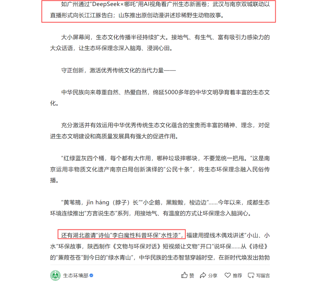 生态文化产品亮点纷呈:创新推出双城联动直播活动——“今天我向长江江豚告白”,吸引超120万网友“云守护”长江生态,创下武汉环保主题直播新纪录,“长江江豚”城市生态核心IP深入人心,实现了跨区域生态话题的破圈传播。爆款科普短视频《李白讲水性漆》以“古今对话”创新形式,将传统文化与环保科普深度融合,让诗仙穿越千年为环保代言,魔性演绎让环保理念高效触达大众。