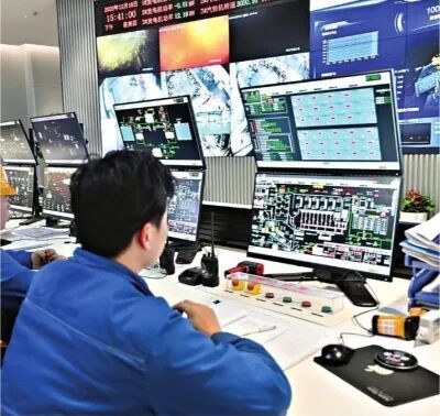固体废物入炉后,全流程便由AI系统接管。它如同智慧大脑,先精细铺排,分析其类型与干湿程度,精准计算最优燃烧温度与风量。“以前燃烧参数调控全凭师傅经验,培养成熟技工需5—8年,现在AI学习20天,能力就相当于5年的老师傅。”设备部经理介绍,AI系统上线,彻底告别“凭经验、盯屏幕”的粗放模式。正在控制室值班的工作人员对此深有体会:“以前我们值班盯着屏幕眼睛都不敢眨一下。有时恨不得变身‘八爪鱼’来控制一排按钮。现在我们工作轻松多了,值班室的人也减少了。”