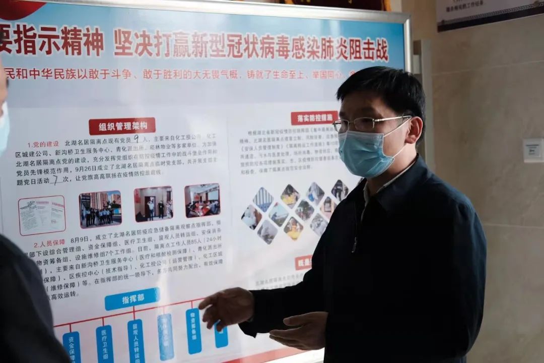 在青山区北湖名居疫情隔离点,听取了隔离点工作人员的工作介绍,张朝辉强调涉疫垃圾要确保“日产日清”,生活废水处置、人员防护和消杀措施务必严格到位。