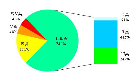 2019年1-6月,1940个国家地表水评价断面中,水质优良(Ⅰ-Ⅲ类)断面比例为74.5%,同比上升4.4个百分点;劣Ⅴ类断面比例为4.3%,同比下降2.6个百分点。主要污染指标为化学需氧量、总磷和氨氮。