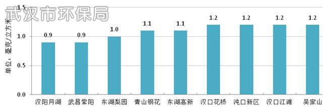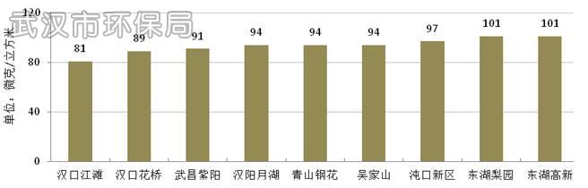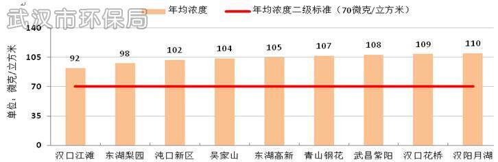 2015年武汉市PM10年均浓度为104微克/立方米,超过国家环境空气质量二级标准0.49倍,较2014年下降8.0%。PM10日均浓度范围为12~282微克/立方米,达标率为81.8%。各国控监测点PM10年均浓度范围为92~110微克/立方米。
