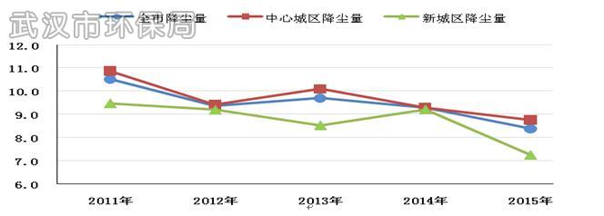 2015年全市降尘平均值为8.37吨/平方公里•月,比2014年下降0.90吨/平方公里•月;中心城区降尘平均值为8.75吨/平方公里•月;新城区降尘平均值为7.24吨/平方公里•月。近5年武汉市降尘污染总体呈下降趋势。