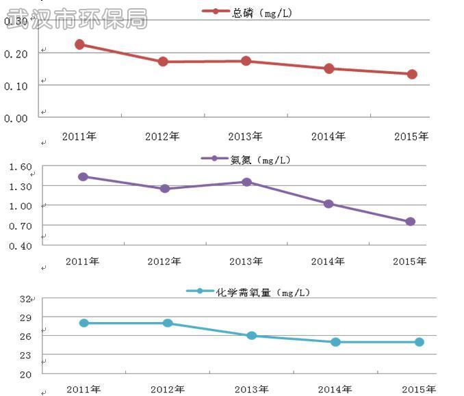 图19 2011~2015年武汉市湖泊总磷、氨氮和化学需氧量浓度图