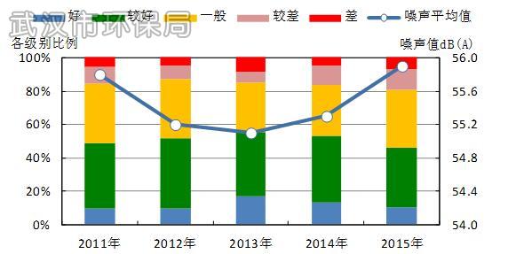 近5年武汉市区域环境噪声昼间时段平均在55.4分贝左右,总体保持稳定。