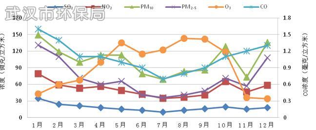 2015年武汉市NO2年均浓度为52微克/立方米,超过国家环境空气质量二级标准0.30倍,较2014年下降5.5%。NO2日均浓度范围为13~126微克/立方米,达标率为89.0%。各国控监测点NO2年均浓度范围为43~58微克/立方米。