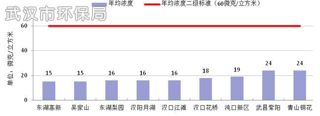 2015年武汉市SO2年均浓度为18微克/立方米,达到国家环境空气质量二级标准,较2014年下降14.3%。SO2日均浓度范围为6~79微克/立方米,达标率为100%。各国控监测点SO2年均浓度范围为15~24微克/立方米。