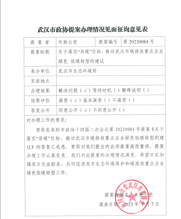 贵单位提出的“关于落实‘双碳’目标,推动武汉市碳排放重点企业绿色低碳转型的建议”的提案收悉,现答复如下: