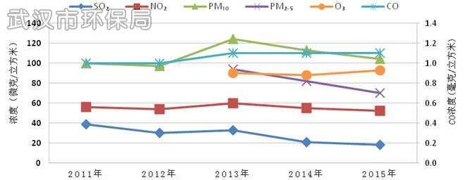 2011~2015年城区可吸入颗粒物、二氧化氮、一氧化碳年均浓度基本保持稳定,细颗粒物、二氧化硫年均浓度有所下降,臭氧年均浓度略有上升,其中,细颗粒物和臭氧是2013年开始新增的监测项目。2013年受冬季区域性污染和大气扩散条件较差等因素的综合影响,可吸入颗粒物、细颗粒物、二氧化硫、二氧化氮和一氧化碳等5项污染物年均浓度相对较高。