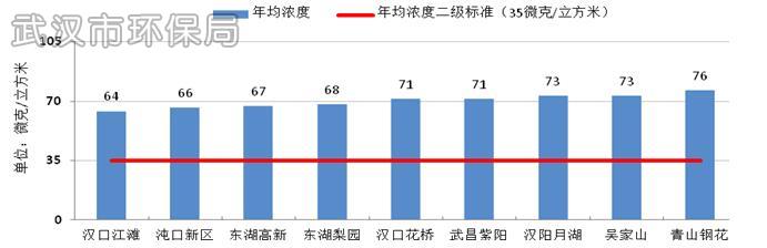 2015年武汉市PM2.5年均浓度为70微克/立方米,超过国家环境空气质量二级标准1倍,较2014年下降14.6%。PM2.5日均浓度范围为11~280微克/立方米,达标率为66.0%。各国控监测点PM2.5年均浓度范围为64~76微克/立方米。
