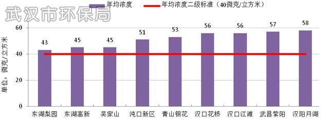 2015年武汉市PM10年均浓度为104微克/立方米,超过国家环境空气质量二级标准0.49倍,较2014年下降8.0%。PM10日均浓度范围为12~282微克/立方米,达标率为81.8%。各国控监测点PM10年均浓度范围为92~110微克/立方米。