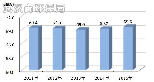 按照《声环境质量标准》(GB3096-2008)评价,2015年武汉市中心城区昼间道路交通噪声平均等效声级为69.6分贝,比去年上升0.4分贝,道路交通噪声强度等级为二级,评价为“较好”。评价为好和较好水平(70分贝以下)的路段占全部监测干道总长度的61.2%,与2014年相比,下降0.7%。