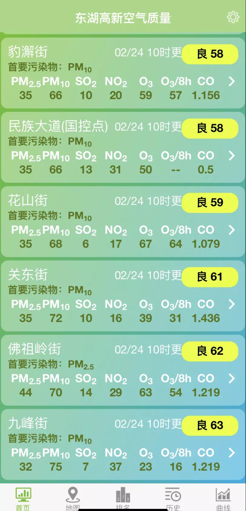 图为武汉东湖高新区空气质量小型站APP显示24日10时各街道实时空气质量状况。