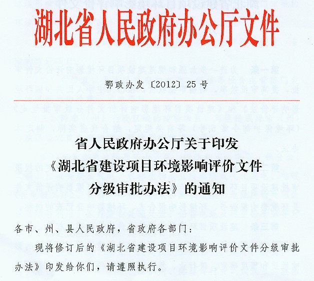 省人民政府办公厅关于印发《湖北省建设项目环境影响评价文件分级审批办法》的通知 (鄂政办发[2012]25号)
