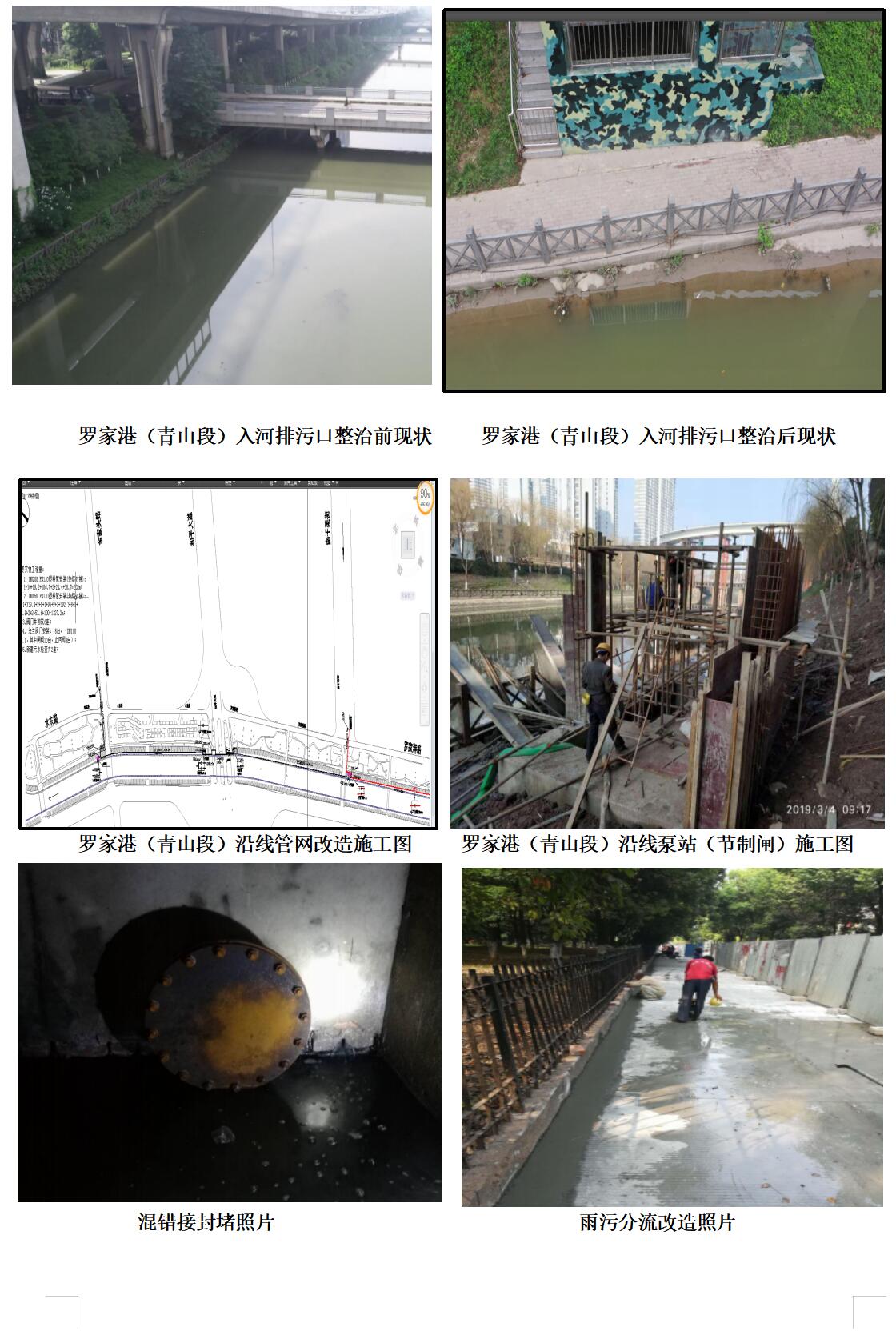 为贯彻落实国家及省、市关于黑臭水体整治的相关要求,青山区政府实施“罗家港(青山段)水质提升整治工程”,采用“源头雨污分流改造+中途混错接节点改造+末端强化截污”,对小区排水出口及市政雨污水管道混错接点进行节点改造;雨污混流排口末端进行强化截污,片区雨污分流及混错接改造后的污水进入121泵站,最终进入污水处理站进行处理,污水不排放至罗家港。经过罗家港(青山段)水质提升整治工程对沿线18个社区做了混错接排查及改造,对罗家港路及周边排水管道做了清淤疏浚工作,实现了此排口雨污分流,且在晴天情况下,收集路面污水经节制闸抽至污水处理厂进行处理,暴雨情况下,初雨池达到一定液位,排放雨水至罗家港。目前该项目已实施完成,有效解决了雨污合流污水混入雨水管网直排问题。